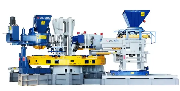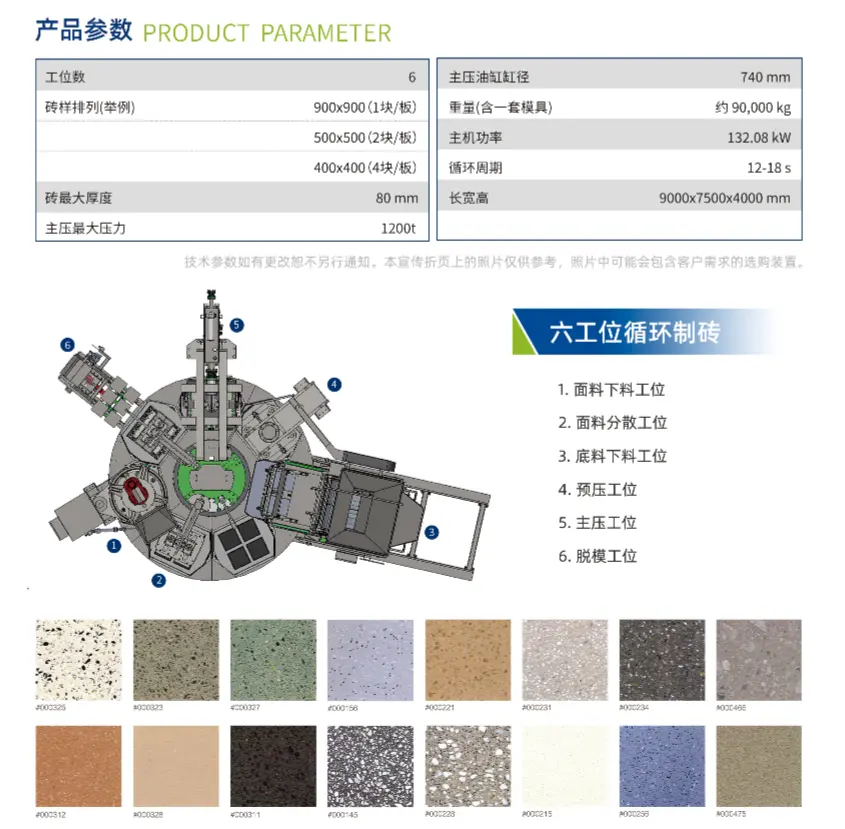 Áp suất chính của thiết bị sử dụng thiết bị nạp dầu chuyển tiếp đường kính lớn, có thể phản ứng nhanh, di chuyển nhạy và có thể tạo ra áp suất 1.200 tấn. Trạm thủy lực sử dụng một máy bơm biến thiên, điều chỉnh tốc độ và áp suất thông qua van tỷ lệ, tiết kiệm năng lượng và dễ vận hành. Bàn xoay sử dụng ổ trục xoay cực lớn, được điều khiển bởi động cơ servo có bộ mã hóa, vận hành ổn định và điều khiển chính xác. Đồng thời, nó sử dụng hệ thống điều khiển trực quan tiên tiến và PLC sử dụng dòng Siemens S7-1500. Thiết bị dỡ vật liệu có thiết bị khuấy tích hợp, sử dụng bàn xoay định lượng để dỡ tải, lượng vật liệu chính xác và ổn định.